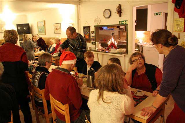 | Märta, Gulli och Knut lät sig väl smaka av julgröten. | Lite mingel blev det också mellan tuggorna. |