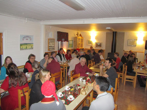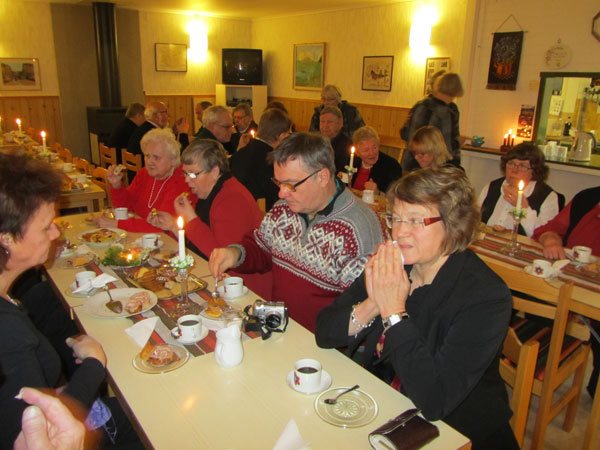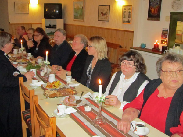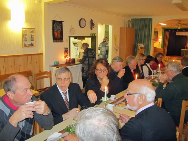 med drygt tjugo närvarande. Efter gudstjänsten bjöds till väldukade kaffebord. |
