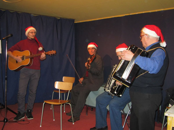 uppskattat program av nästan 100 besökare. Lotteri, musikfrågetävling, allsång