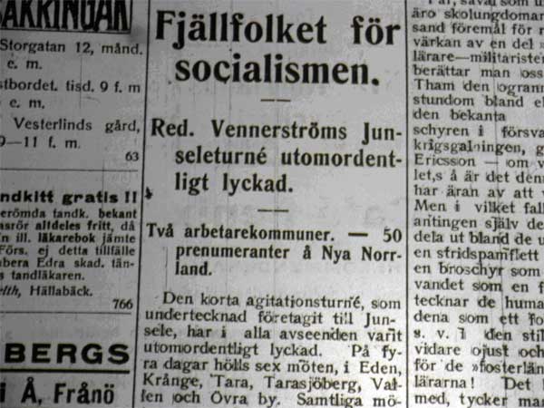Fjällfolket för socialismen. Red. Vennerströms Junseleturné utomordentligt lyckad. Två arbetarekommuner. – 50 prenumeranter å Nya Norrland. |